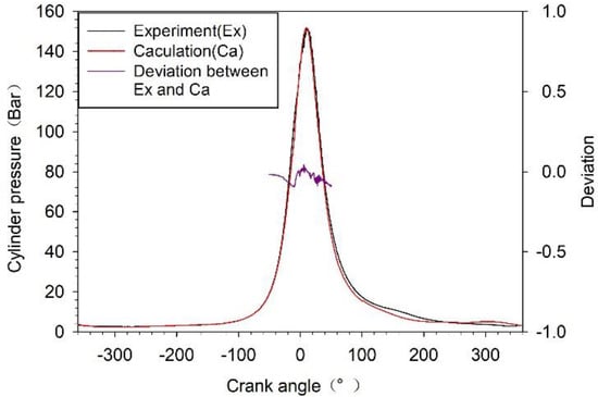 From the comparison results of Figure 3 and Table 2, it can be seen that the deviation of the cylinder’s pressure at each point is less than 9.5% during the combustion stage and the average value of them is 3.68%. The errors of the characteristic values are within ±5.5%. It indicates the calculated cylinder pressure curve in a positive agreement with the experimental result. The errors between the calculated value on the performance and thermal parameters of the diesel engine with the test results are within ±3.5% in Table 3, which validates the accuracy of the model.