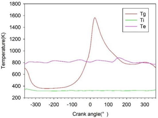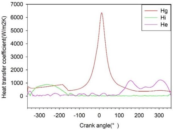 The intake passage gas transient temperature (Ti), exhaust passage gas transient temperature (Te), and in-cylinder gas transient temperature (Tg) curves are shown in Figure 4. The intake passage gas transient heat transfer coefficient (Hi), the exhaust passage gas transient heat transfer coefficient (He), and the in-cylinder gas transient heat transfer coefficient (Hg) curves are shown in Figure 5.