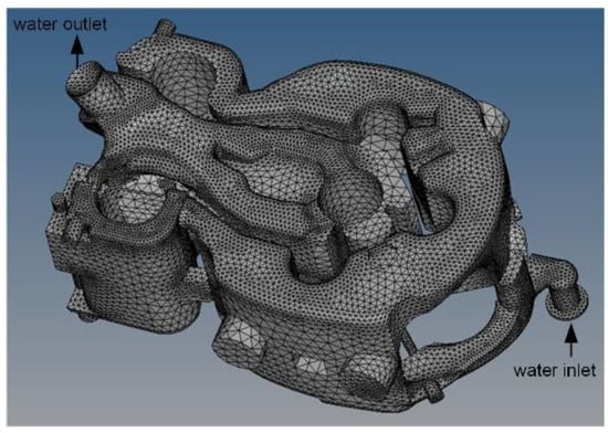 The cooling water jacket of the cylinder head is complex and the three-dimensional geometric model cannot be obtained directly from the model of the cylindrical head. It needs to be wrapped from the model of the cylindrical head in HyperMesh software. Other unrelated structures of the cooling water jacket were removed by delete command, and the inlet and outlet passages were closed by using the command of the surface-spline/filler, which was convenient for mesh and boundary completeness of the model. According to the mesh division and element attribute definition for the water jacket, the FE model of the fluid region with 43,696 nodes and 186,600 elements in total are shown in Figure 6. The requirements of CFD calculation on mesh quality mainly include skewness, growth rate, aspect ratio, and alignment with the flow of the gird. Specifically, the grid skewness cannot be higher than 0.95, the growth rate cannot exceed 1.4, the aspect ratio is less than 5:1, and the alignment with the flow grid line is consistent with the flow direction to reduce false diffusion. At the same time, it ensures that the flow monitoring curve does not change drastically with the increase of the iteration numbers after the calculation residuals converge. The mesh quality of the cooling water jacket meets the requirements of the calculation and algorithm convergence.