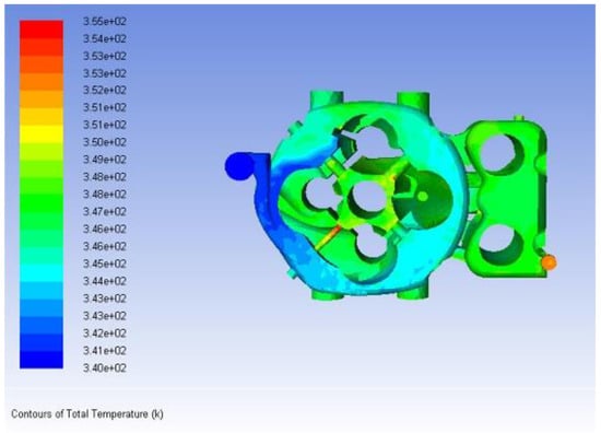 The temperature of the cooling water in the cylindrical head was high. It was easy to form turbulence or even boiling state [31] as well as certain speed fluctuation, cavity flow, vortex, and rotation in the cooling water jacket of the cylindrical head existed at the same time. The CFD calculation of the cooling water jacket was suitable for double-precision, a steady-state coupled algorithm, and a realisable k-epsilon turbulence model. The cooling water jacket wall surface was set as a no-slip condition. The flow difference between the inlet and outlet was monitored to ensure that the flow monitoring curve did not change dramatically with the increase of the number of iterations after the residual convergences. The calculation contours of the steady-state temperature and heat transfer coefficient of the cooling water jacket are shown in Figure 7 and Figure 8.