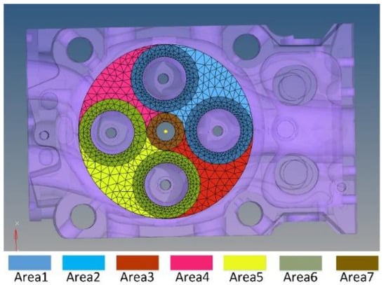 Heat transfer coefficient was related to the thermal physical properties of the fluid, the dynamic factors of the fluid flow, the state of the fluid flow, the thermal state of the heat transfer wall, and the geometric factors of the heat transfer wall [33]. The heat transfer coefficient of the cylinder head’s flame surface calculated by the working process could not reflect the thermal state and geometric factors of the actual cylinder head’s flame surface. If the heat transfer coefficient of the flame surface was taken as a unified value, there was a large error between the calculated results and the test results in some areas [34]. The method for improving the calculation accuracy was implemented in which the flame surface was divided into different areas, according to the general law of thermodynamics followed in Formula (8) [35,36]. The minimum error was taken as the target to determine the heat transfer coefficients of each area. Through the cooling, structure, geometry, and thermal state, the flame surface was divided into seven areas: the exhaust valve area (Area 1), the flame surface area between exhaust valves (Area 2), the flame surface area between the exhaust valve and intake valve (Area 3), the flame surface area between the intake valve and exhaust valve (Area 4), the flame surface area between the intake valves (Area 5), the intake valve area (Area 6), and the flame surface area around the injector (Area 7). They are shown in Figure 9. TBCs of the cylindrical head by the above methods are shown in Table 5.