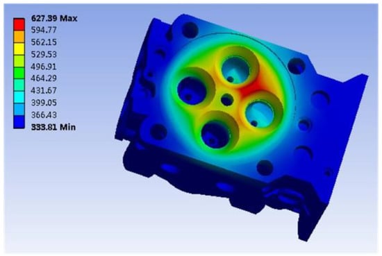 By defining the material properties of the cylindrical head and selecting the type of calculation, the temperature and thermal stress field of the cylindrical head calculated by workbench are shown in Figure 10 and Figure 11. The thermal load results above were imported into the static structural module, and then the boundary conditions, such as the pressure of the flame surface and the constraints of the bolt holes, were exerted, and then thermo-mechanical coupling stress field is calculated, as shown in Figure 12.