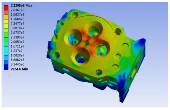 The boundary conditions of the mechanical load of the cylindrical head mainly include the forces and the constraint. The forces affecting the cylindrical head are mainly composed of the gas combustion pressure and the valve seating forces [37]. The valves opening and closing process had transient impacts on the cylinder head. The valves seat withstood the changeable pressure, which was small during the valves opening and closing process. Therefore, the peak fire pressure in the combustion process was used for the mechanical strength evaluation of the cylindrical head and was applied vertically to the flame surface. In terms of constraints, there were full constraints on the contact surface of the cylindrical head and the cylindrical liner. These constraints were caused by the cylindrical head bolts. Consequently, the six degrees of freedom of the cylindrical head bolt holes were fully constrained.