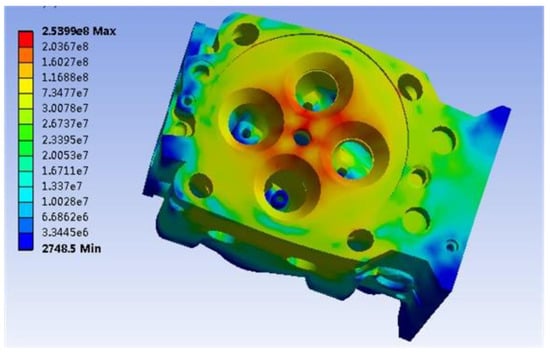 It can be seen from Figure 10 that the temperature at the fuel injection port and the nose bridge of each valve is higher, the maximum temperature (Tm) is 627.39 K, and the radial temperature gradient of the nose bridge is larger. This is due to the narrower structure and the cross-cooling water pipe, which are key areas for thermal load evaluation. Figure 11 and Figure 12 demonstrate that the pattern of the thermal stress distribution is consistent with that of the temperature field distribution. A pattern of coupling stress field considering the mechanical load is consistent with thermal stress. The maximum thermal stress is 232.95 MPa, the maximum thermo-structural coupling stress (Sm) is 253.99 MPa, and the values of Sm in the areas of the exhaust nose bridge and fuel injection port are higher than the other areas. Consequently, the mechanical load has a low influence on the coupling stress of the cylinder head, accounting for only about 8.28%. It reveals that thermal stress in evaluating the cylindrical head’s structural strength is much higher than the mechanical stress.
