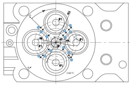 The current cylindrical head temperature measurement methods include the THP method and the thermocouple method [4,38,39]. The THP method was used by the characteristic relationship between the hardness of the metal material with temperature. Due to its convenient installation, the flexible detection, and the low amount of damage to the structure, the THP method was applied to measure the temperature of the cylindrical head’s flame surface. The physical arrangement of the 13 measurement points is shown in Figure 13. It is helpful to obtain small measurement errors by maintaining a period of the highest temperature and rapid cooling for the cylindrical head [40]. The positional relationship and the errors for measuring points are shown in Figure 14 and Table 6.