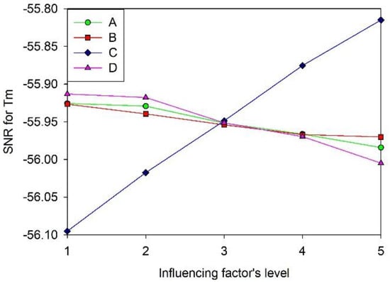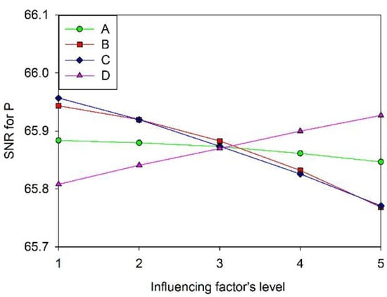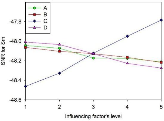 By calculating the SNR of the optimisation objectives in Table 7, the effect diagrams of the SNR for Tm, Sm, and P at different levels of influencing factors are determined and shown in Figure 15, Figure 16 and Figure 17.