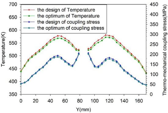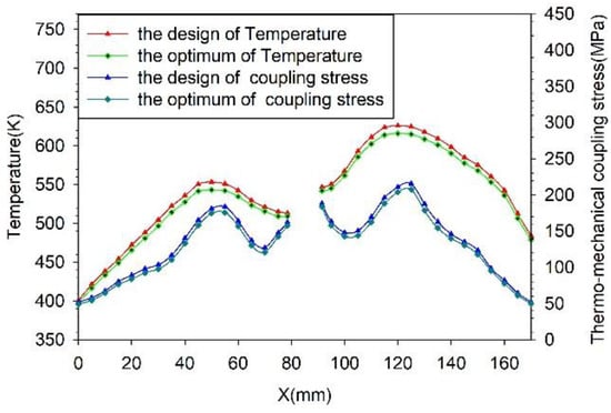 To compare and verify the results of the optimisation scheme, an optimised combination of the influence factor levels was substituted into the models for the solution. The value of P was 1976.16 kW, which met the requirement and was slightly increased by 0.3%. Simultaneously, the temperature and stress values of the cylindrical head’s nose bridge area were extracted at a certain distance in the radial direction of X (through the line of the measuring points 6 and 10 numbers shown in Figure 14) and Y (through the line of the measuring points 13 and 2 numbers shown in Figure 14). The comparisons of the design and optimum in the X and Y directions are shown in Figure 18 and Figure 19.