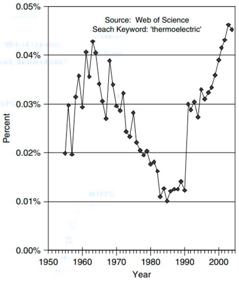 Open literature publications on the Web of Science database with the keyword “thermoelectric” as a percentage of all publications on the database for each year from 1955 to 2003 [].