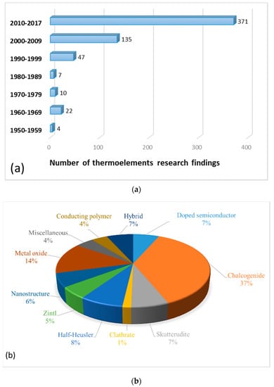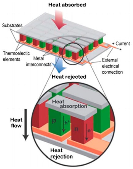 Ever since the discovery of TE materials, their use has been limited to thermocouples for temperature measurements due to their very low efficiency []. It was only in the 1960s when relevant investigations into thermoelectric semiconductors developed more applications in the field of refrigeration and power generation.