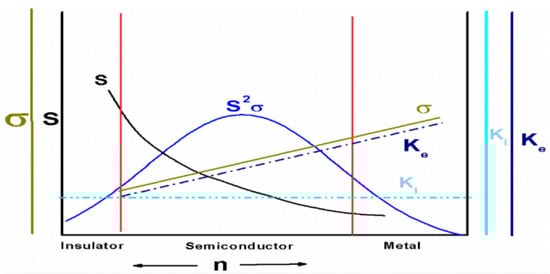 where S is the Seebeck coefficient (µV/K), σ the electrical conductivity (1/Ωm) and K is the thermal conductivity (W/mK). This equation shows that, to maximize the ZT of a material, it must meet the following criteria: (i) low thermal conductivity to maintain a considerable temperature difference between the two ends of the material; (ii) high electrical conductivity to reduce the internal resistance of the material and consequently the Joule effect; and (iii) a high Seebeck coefficient, required to obtain a high voltage [,]. Unfortunately, according to the graph of Figure 3, these parameters are well correlated and it is very difficult to optimize them independently, especially for conventional metals.