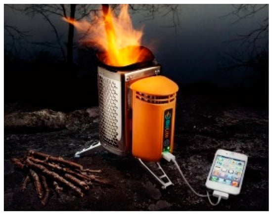 Several products designed for public use have been marketed. One such was the thermoelectric candle radio (1990), which uses the heat from candles to power a radio via a FeSi2 TE module []. These applications have become obsolete with the emergence of other more practical technologies, but despite that, more specific applications are still emerging, such as the CampStove shown in Figure 9. This appliance, designed for camping in general, burns wood to produce 2 W of 0.4 A and 5 V power using a thermoelectric generator to which the connection of the electrical devices is made via a USB port [].