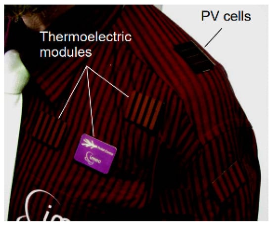 Leonov and Vullers [] published an interesting review on WTEGs, focusing on rigid- and flexible-type thermoelectric generators. They concluded that the wearable thermoelectric generator style was mature, and that the major concern was to improve the efficiency of the generator and make it thinner and more flexible. These authors conducted extensive research on rigid substrate TEGs. They developed different WTEG products that used body heat, such as the wireless electrocardiography system integrated into an office shirt. This product was powered by 17 small TE modules integrated into the front side of a shirt, as shown in Figure 10. They converted the body’s natural heat flow into 0.8–3 mW of electrical energy, depending on the physical activity of the person [].