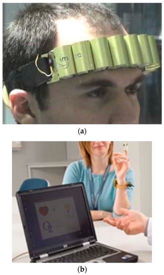 One of the leading companies in this field is IMEC (Belgium), which has been working on thermoelectric generation by people since the 2000s, with a view to power electronic health care systems. IMEC and the Holst Centre have developed several wireless sensors, such as the Body-powered Electroencephalogram Acquisition System, which produces 2–2.5 mW of power and is worn as a headband, shown in Figure 11a []. They have also developed a wireless pulse oximeter (2006), powered entirely by a TEG-style watch using commercial Bi2Te3 thermopiles, shown in Figure 11b, and in which the generator develops around 89 µW of power [].