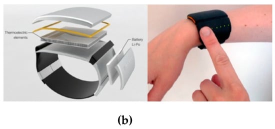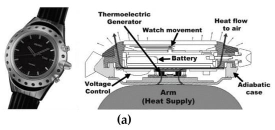 The first thermoelectric wristwatch powered by converting body heat into electrical power was marketed by Seiko and Citizen, and dates back to 1999 [,]. The Seiko watch (Figure 12a) produced 22 µW of electrical power, and an open-circuit voltage of 300 mV with efficiency of about 0.1% []. Another example is the Dyson TE bracelet (2012), shown in Figure 12b, which, using body heat, charged a battery integrated into it for charging a mobile phone or any other mobile device.