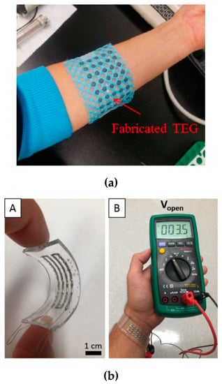 Because of the drawbacks of rigid modules, i.e., the high thermal resistance between skin and the TEG, flexible modules are more suitable for power generation from body heat, as they can be adapted to the shape of the body, thus increasing the useful surface area for heat capture and reducing thermal contact resistance []. Francioso et al. [] developed a flexible and wearable micro thermoelectric generator, composed of an array of 100 thin film thermocouples of Sb2Te3 and Bi2Te3, designed to power very low-consumption electronical ambient assisted living (AAL) applications. The best result obtained was 430 mV in open circuit, and an electrical output power up to 32 nW at 40 °C. Kim et al. [] manufactured a flexible fabric-shaped TEG, with 3D printing technology, composed of 20 thermocouples and with a thickness of 0.5 mm, as shown in Figure 13a. The TEG, when applied to a human body, generated an electrical power of 25 mV at an ambient temperature of 5 °C. A new approach was presented by Suarez et al. [], using standard bulk legs interconnected to a stretchable low-resistivity eutectic alloy of gallium and indium (EGaIn), all in a flexible elastomer package, as shown in Figure 13b. The authors reported a figure of merit (ZT) of 0.35, which they claimed to be better than that of any other similar device reported in the open literature. Zadan et al. [] introduced a soft and stretchable thermoelectric generator (TEG) with the ability to expand, to explore the integration of this TEG into wearable technologies. All investigations conducted so far have suggested that this option is only viable at moderate temperatures, i.e., indoors in particular, and this limits its application together with the high cost of TE modules [].