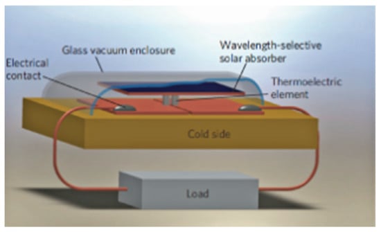 A solar thermoelectric generator (STEG) is a system designed to recover heat from solar radiation and convert it into electricity using a thermoelectric generator (TEG). It is becoming a technological alternative, and is competing with the dominant solar photovoltaic systems despite its low conversion efficiency compared to photovoltaic technology []. STEGs are classified according to the type of optical sensors used, namely, an optical concentration system or not. Optical concentration sensors are usually cylindrical lenses, Fresnel lenses, parabolic mirrors, flat mirrors or parabolic concentrators. Non-concentrated solutions are rather limited to flat plate collectors evacuated or not evacuated, and vacuum tubes []. Karthick et al. [], in a recent review, reported that the use of optical concentrators, combined with heat pipe tubes, improves the efficiency of solar thermoelectric generators (STEG).