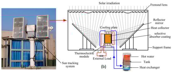 Concentrating Solar Thermoelectric Generators (CTG): (a) An experimental prototype of the Concentrating Solar Thermoelectric Generator System; (b) Details of the CTG unit [].