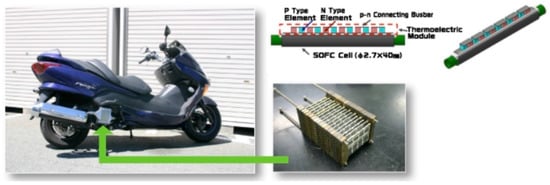 - Schlichting, A.D.; Anton, S.R.; Inman, D.J. Motorcycle waste heat energy harvesting. In Proceedings of the 15th International Symposium on: Smart Structures and Materials & Nondestructive Evaluation and Health Monitoring, San Diego, CA, USA, 9–13 March 2008; Volume 6930, p. 69300. [Google Scholar] [CrossRef]