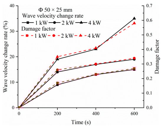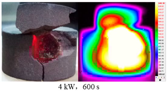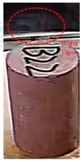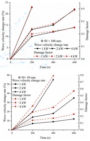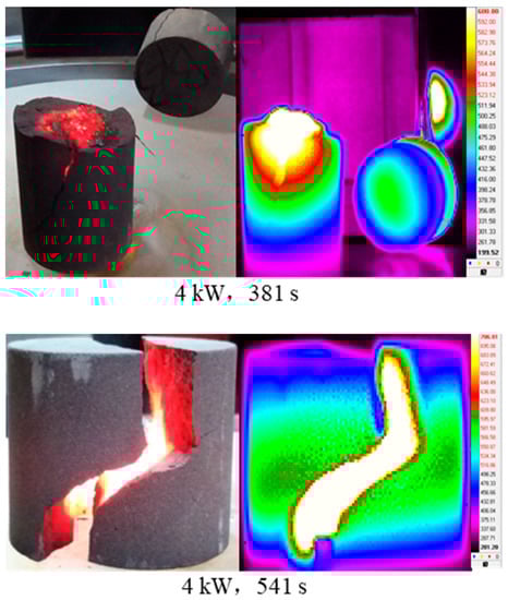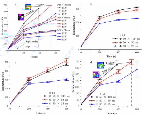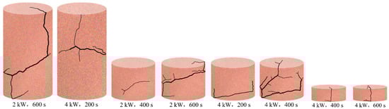 - different size specimens have different crack-propagation modes. The main crack of φ 50 × 100 mm specimens usually starts from the middle of the height of the specimen; the main crack of φ 50 × 50 mm specimens usually starts from the middle or bottom-end surface of the specimen height; the main crack of the φ 50 × 25 mm specimen starts to crack from the vertical surface of the specimen. As the heating time increases, the crack length and width also increase;