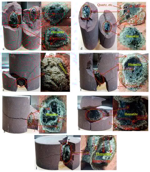 - different sizes of specimens have different fracture modes (Only sandstone with the same mineral composition). The φ 50 × 100 mm sample fractured from the middle of the sample into two sections, the φ 50 × 50 mm sample fractured from the top of the sample into two parts in an approximately vertical direction, and φ 50 × 25 mm specimens have fractured bumps on the local rock blocks at the top of the specimens;