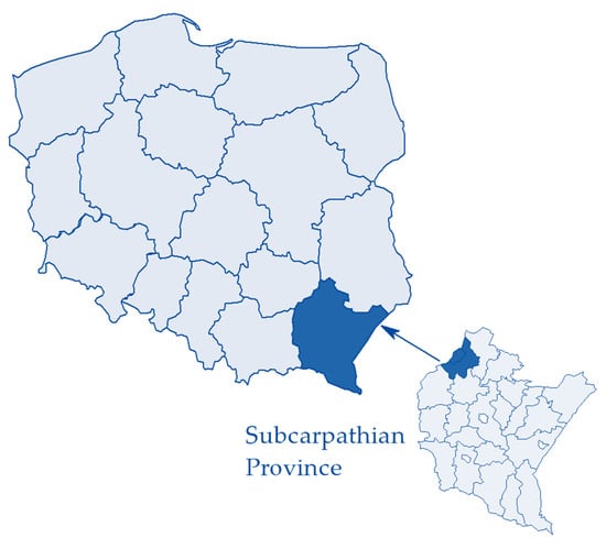 The identified water-supply system is located in Poland’s Subcarpathian province-region, and relates to a supplied city located on the right bank of the Vistula and covering 127 km2 around 50°02′N and 22°00’E (Figure 1). The city under study comprises some 180,000 inhabitants supplied with water. It has 1546 inhabitant/km2 and is at 197–384 m above sea level. This area has hot summers, relatively small amounts of rainfall (ca. 510 mm) and winters that are not especially severe.