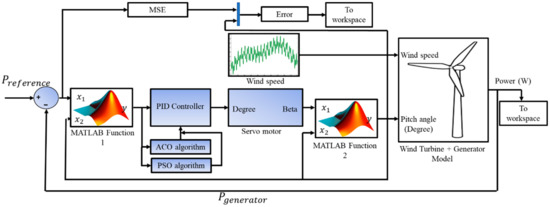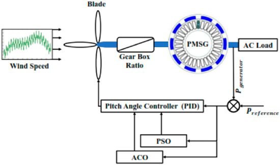 The nature-inspired algorithms such as ant colony optimization (ACO), particle swarm optimization (PSO), GA, artificial bee colony (ABC), and bat algorithm (BA) have been developed with promising results in optimization applications. For the pitch angle of a wind turbine, PSO and GA are implemented by [21] and [18]. To deal with the control problem, a PID controller is designed to provide the required pitch angle control that can control the actuator. Previous studies have shown that the PID controller is well known in pitch angle control, but it has been tuned with the trial and error method or classical method in most studies. However, these methods are extremely time consuming, and it is difficult to get optimal values in most cases. In addition, the promising ACO and PSO algorithms have not yet been investigated to optimize a PID controller for pitch angle control. The proposed wind power generation system is shown in Figure 1.