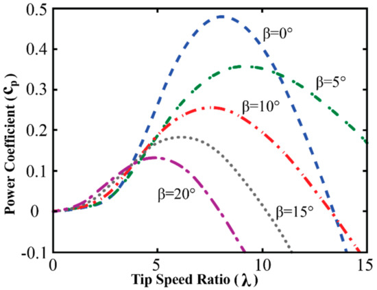 Power coefficient vs. tip speed ratio for different pitch angles [27].