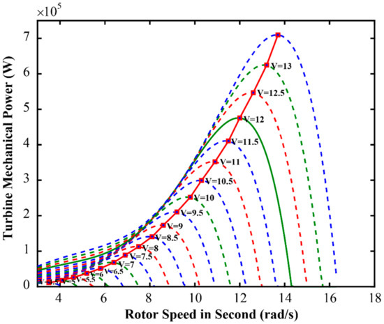 In general, the wind turbine generator power has been changed by the wind speed and rotor speed, as shown in Figure 3. Besides, the turbine mechanical power is increased by the rotor and wind speed. Once the turbine reaches the rated power, a further increase of wind speed forces the turbine’s rotor to rotate above its rated speed. In this circumstance, the rotor speed and pitch angle need to be controlled accordingly; otherwise, turbine blades will be damaged.