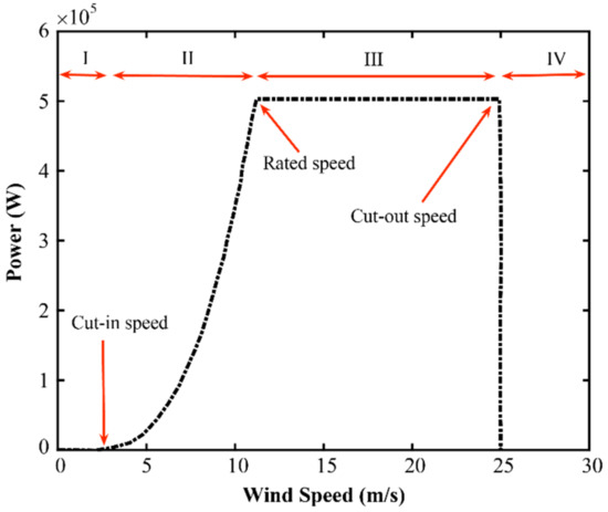 On the other hand, the WT operating region has been divided into four areas, which are shown in Figure 4. In the first region, the wind speed reaches from 0 to the cut-in speed where the output power is 0, because the WT does not execute operation. The second region indicated that the wind speed is from cut-in to rated speed. In this region, the WT has started to execute its operation because it reaches the cut-in speed. The third region shows that the wind speed is between the rated and cut-out speed where WT can produce the rated wind power with a nominal wind speed. The fourth region is beyond the cut-out speed. Hence, in region IV, the wind speed will be increased, and the output power will increase as well. This increased power indicates the turbine’s output power above its rated level. Hence, the position of the blades will be changed. Therefore, pitch angle and power parameters need to be controlled for keeping the output power within the rated value.
