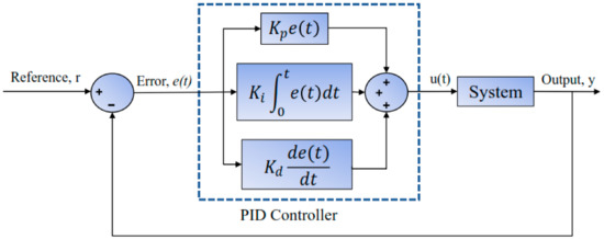 The PID controller has been widely used in the industry for controlling purposes. The PID controller is selected in this study for some of its characteristics such as flexibility, reliability, and easy operation system. It consists of three control parameters: namely, proportional , integration , and derivative . Each controller parameter has an individual contribution for controlling any kind of system. A typical block diagram of a PID controller with a feedback loop is shown in Figure 4. In the closed-loop PID controller, the error of the system goes to the P, I, and D until getting the desired output.