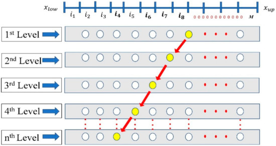 for each and every level, which has nodes on it, and there are nodes in total. is the state vector of an ant whose entire tour is shown in Figure 6 with the travel index . The travel index is directly dependent on the cumulative probability from the probability of the ant k to move the node on the level. For example, if , , and the generated random number lies between 0.8 and 0.9, while the first travel index, , is chosen as 8 (eighth column of the ) [35]. Those processes have been continued until all the travel indexes are found. The values of the parameters , held by an ant, are represented as