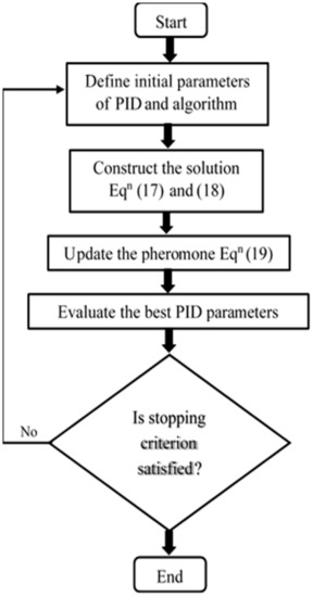As shown in Figure 6, the algorithm starts with the initialization of the pheromone track. The desired optimization objective function is calculated for each ant, and the maximum value is stored as . The construct of an ant-completed solution of an objective problem for each iteration according to the state transition of probabilistic rule is shown in Equation (18). Regarding the quantity of pheromones at the third step, updating the role of a global pheromone is applied in two phases. First, there is an evaporation phase, where a fraction of the pheromone evaporates, and then there is a reinforcement phase, where each ant deposits an amount of pheromone that is proportional to the objective function of its solution. The process is iterated until the stopping criterion is satisfied, as shown in Figure 6. The flow chart of ACO algorithm is illustrated in Figure 7.