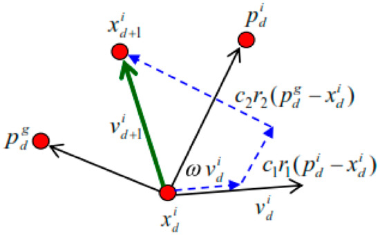 The position of each parameter is illustrated in Figure 8. The first part of Equation (20) represents the previous velocity. The required momentum for the particles to roam across the search space comes from this part of the equation. The second part of Equation (20) stands for the personal thinking of each particle, which is known as the “cognitive” part or component. The particles are encouraged to move toward their own best positions with the help of the cognitive component. The third part of Equation (20) helps find the optimal global solution, which is known as the “social” component. This part repeatedly drags the particles in the direction of the global best particle found so far. In addition, it represents the effect of the collaboration of the particles. The flow chart of PSO is shown in Figure 9.