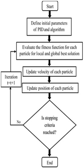 PSO is one of the most appealing and widely used meta-heuristics proposed by Kennedy and Eberhard in 1995 [38,39]. This algorithm is capable of solving more complex problems because of its meta-heuristics nature. It is simple and easy to implement. The fundamentals of PSO are inspired by swarm behavior. This meta-heuristic is comprised of multiple particles. Each particle consists of three components: position, current objective value, and velocity. It conserves the global best value, which is related to the best objective value. The global best value is also related to the global best position at which the global best value is achieved [38].
