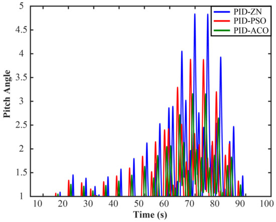 The total electrical wind power is produced by the WPG system shown in Figure 14a,b, which shows wind power at the zoomed condition. Figure 14b shows that PID-ACO keeps the generated wind power below W, which is very near the desired output power () of the WTG. However, the PID-PSO controller gives an output power (OP) value that is slightly higher than the desired power value. It can be also noticed in Figure 14a that the output power of the WTG with the PID-ZN controller is fluctuating at different points, which are higher than the PID-PSO and PID-ACO controllers’ output power. In addition, the output power of WTG by PID-ZN and PID-PSO controllers show higher than the desired output power of WTG. Based on the above discussion, it can be concluded that the hybrid ACO-PID controller provided a promising result in comparison to PID-ZN and PID-PSO controllers regarding rated wind turbine power under variable wind speed. As we know, the PID controller parameters can provide the desired power of WTG by the accurate pitch angle controlling, but it does not occur. So, the ZN and PSO were not tuning the parameters properly based on Figure 12 and Figure 14. Figure 12 shows the pitch angle by the proposed controllers. Figure 12 shows the maximum pitch angle offered by the PID-ZN and PID-PSO respectively to compare them with PID-ACO. In this circumstance, the WPG provides the higher desired power under variable wind speed, so, except for PID-ACO, those controllers are not working properly.