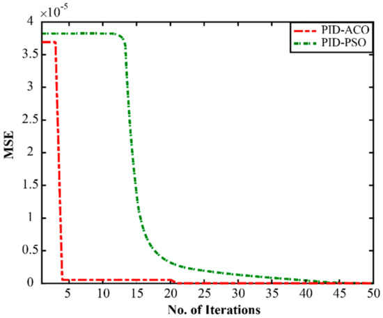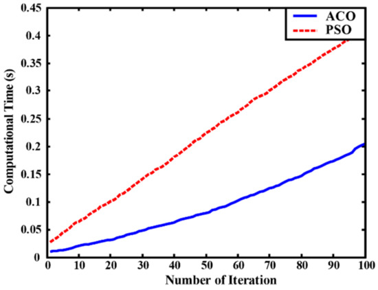 The mean square error (MSE) of the ACO and PSO algorithms is shown in Figure 13. It is the convergence curve of the proposed algorithm. Figure 13 shows the number of iterations of ACO and PSO at the x-axis and MSE at the y-axis. After analysis, Figure 12 shows that the ACO algorithm error reaches 0 after 21 iterations, and PSO reaches 0 at 43 iterations. The ACO algorithms show a better result regarding MSE in comparison with the PSO algorithm. Its reflection of the MSE error is displayed in the computational time of the algorithms.