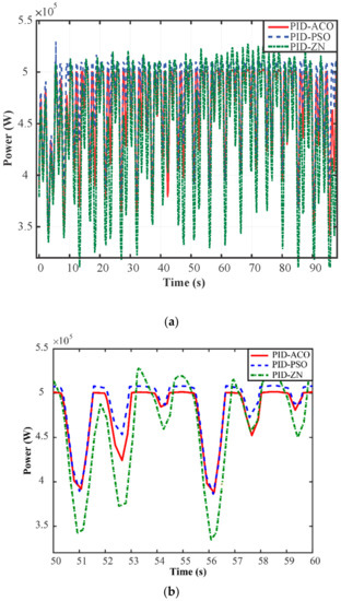 The PID controller parameters have been optimized by ACO and PSO algorithms through MATLAB. At first, there are some ACO and PSO parameters selected for conducting optimization processes; those are shown in Table 2. After starting the process of the model, the system evaluates the objective/cost function that refers to the PID controller Equation (15). The cost function of the ACO and PSO is the error between the desired power and the actual power. After each iteration, the optimum values of the PID parameters are updated and stopped when the maximum iteration number is reached or when the objective function criterion is satisfied. The search range for PID parameters , and was selected randomly between [, , ] and [100, , ]. The optimum PID parameters of three controllers are shown in Table 3.