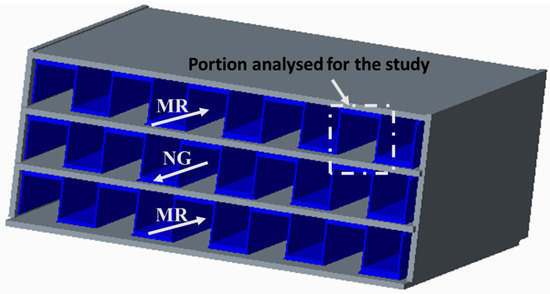 A PFHE is a key component in many industrial applications and has a symmetric design structure. The main assembly of a PFHE is shown in Figure 1. Both MR and NG flow in the counterflow direction.