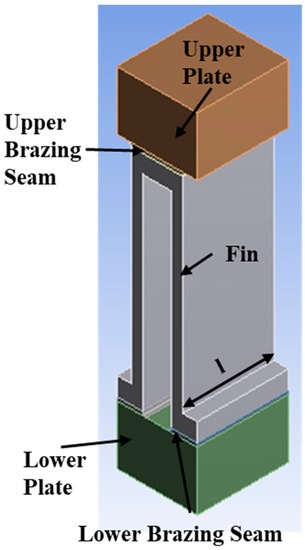 In the current study, the portion of the PFHE employed for analysis is presented in Figure 2. Detailed parts of a PFHE are shown below. In this analysis, a small length (l) of plain fin is analyzed because of the symmetry of the PFHE. In this analysis, the MR side is analyzed at the entrance. This is because typical structural/thermal stress coupling takes place at the entrance, so from here, we can measure the maximum stresses produced in the brazed joint.