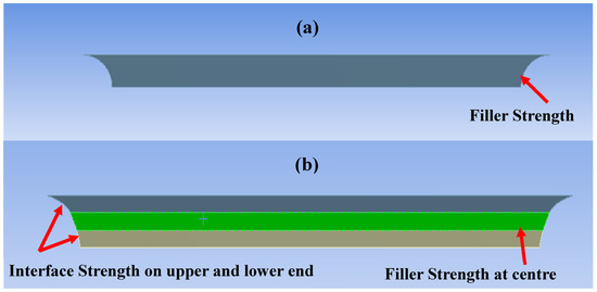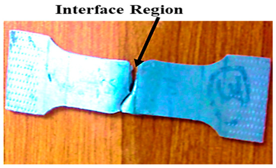 In the first method, post braze joint yield strength was used to make the analysis more realistic. In the second method, brazing seam is divided into three zones for further improvement in analysis method. Upper and lower zones have interface yield strength, whereas the center zone has the yield strength of the filler material, as shown in Figure 4. When experimental validation between Al 3003 and Al 4004 was carried out, the samples that were broken from the joint end had lower strength as compared to the yield strength of the filler material that was earlier used. This phenomenon is shown in Figure 4, which depends on variable heat input and can occur at any stage of brazing [30].