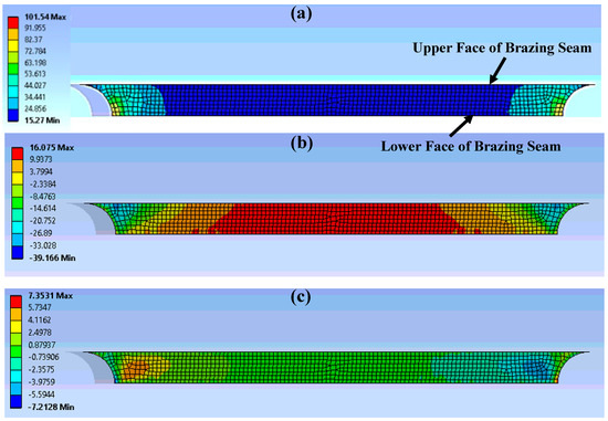Stresses in upper braze seam of PFHE, (a) Equivalent stress (MPa); (b) normal stress (MPa); (c) shear stress (MPa).