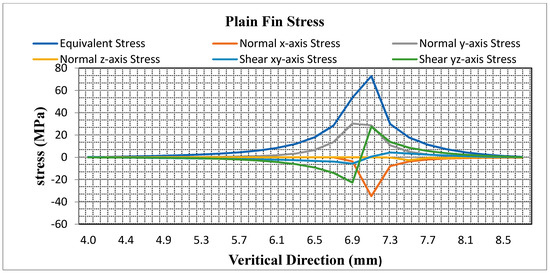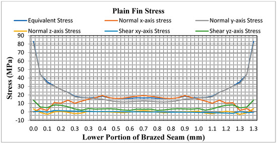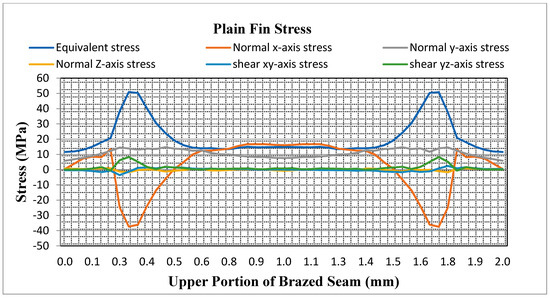 First, this analysis is performed with brazed seam as single entity. Detail of the analysis is shown in Figure 6. Stresses having maximum magnitudes are calculated using the braze seam as single unit. It can be seen in Figure 6 that equivalent stress has a maximum magnitude of 52 MPa for a plain fin braze seam, whereas normal x-axis stress has a maximum magnitude of 40 MPa. Similarly, y-axis stress magnitude is 15 MPa in the upper face of the braze seam. Z-axis stress is 3 MPa and is the lowest of all normal stresses. Shear stresses calculated here are x-y and y-z, respectively, having maximum magnitudes of 3 MPa and 6 MPa.