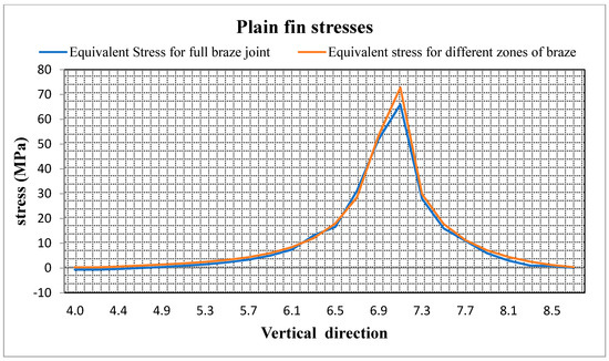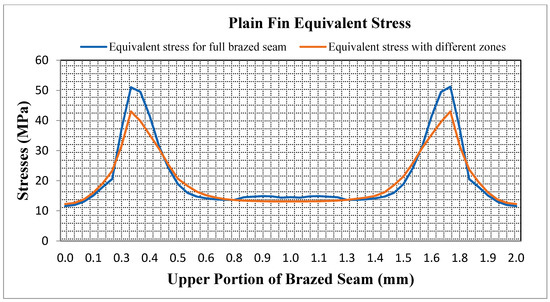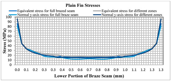 Notably along the lower face of the seam, equivalent and normal y-axis stresses are critical. Therefore, these two stresses are calculated along the lower face of the brazed seam using two methods, i.e., the full braze seam and the three-zones braze seam (presented in Figure 9). It is important to note that the trend followed by stresses along the lower face of seam is totally different from the upper seam of the brazed joint (as shown in Figure 7). Overall, the stresses followed a curved pattern along the lower half of the brazed seam, where the stresses are initially very high due to the edge contact of the fin with the brazed seam, followed by a smooth decrease until the middle that is primarily due to uniformity of brazed seam, and the stresses again increased to 95 MPa due to the sharp edge contact at the other end. More importantly, it can be seen that the equivalent stress for the plain fin brazed seam is increased by 13%, and the normal y-axis stress is increased by 18% when using the different zones method as compared to the single brazed unit method. This is due to the variable properties of different zones, and the lower braze seam strength (when using different zones) is less than the average strength of the full braze seam.
