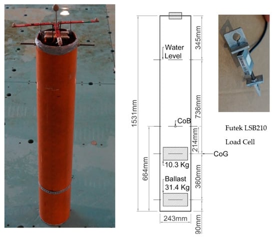 The Froude-scaled [45] floating spar platform (1:36 of full scale) had a mass of 55 kg and consisted of a cylindrical casing of approximately 250 mm diameter and 1.531 m in height, with a series of internal weights and ballasts (Figure 1). The choice of this floating spar platform is guided by the fact that it is a particularly viable and popular form of design of offshore wind [46,47] and due to the feasibility of developing a scaled model for this platform for testing in the wave basin. The inclusion of other designs in a similar testing format in the future will significantly augment the understanding and quantifiable impacts of various forms of damage on their performance over the lifetime.