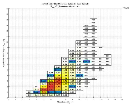 where f is the frequency, fP is the peak frequency and HS is the significant wave height [48]. A scatterplot, obtained from data at Berth B in Belmullet between 1 September 2012 and 16 October 2014, was used to determine a representative set of waves. Figure 4 shows significant wave height (HS) against mean period (TZ), and the percentage of occurrence of each wave case defined by these two parameters.