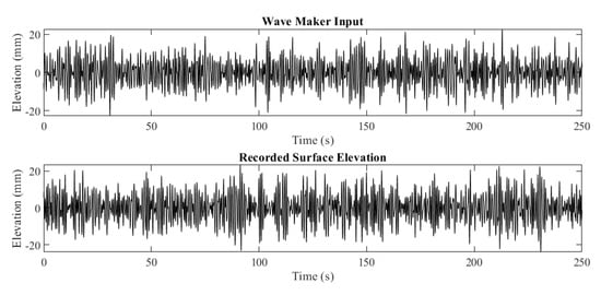 Each irregular Bretschneider wave test was run for 326 s. The first 10 s were still water recording, followed by the start of the wave paddles which were allowed to run for one minute for the waves to be established (i.e., reflected waves and input waves all acting on the system). Subsequently, 256 s of data were recorded for the test, which is the minimum repeat time for the entire time series generated. At the end, a 60 s period of settling time was allowed for recording after the wave maker stopped. Figure 5 presents a comparison between the output of the wave paddles with intended surface elevation values and the surface elevation recorded by the wave probes. The small errors are attributed to wave reflection within the tank. Figure 6 presents the same comparison in the frequency domain and an agreement between the two is observed. Incident and reflected waves are not distinguished by a reflection analysis when analysing platform motion. While in some cases it is preferable to know the incident wave height and to use this for analysis (e.g., for long vessels), since it has a bearing on hydrodynamic analyses, the floating spar platform is relatively small compared to the wavelength for tests and is governed by the buoyancy force, which is related to the surface elevation at that point.