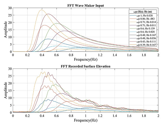Frequency comparison of wave basin surface elevation of test waves between designed and recorded data.