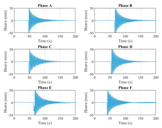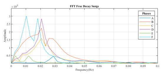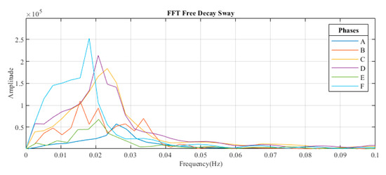 Free decay testing for displacement (sway, surge, heave) and rotation (pitch, roll, yaw) was conducted in still water to characterise the response of the test platform for each structural modification related to the damage phases. Fast Fourier transform (FFT) was used to pick the dominant frequency as the natural frequency of the platform. Due to rotational symmetry and main coupling effects, heave and pitch motions were mainly studied for spar platforms [50,51,52]. For a spar platform, where the geometry is the same for both surge and sway motions, it is reasonable to expect them to be representative of one another. The identified natural frequencies for the heave response are shown in Figure 7 and the range is observed to be between 0.4225 to 0.4444 Hz. It is observed that the various damage configurations did not relate to change in a significant change of natural frequencies. The estimated natural frequencies corresponding to heave, sway, surge and pitch are summarised in Table 4.