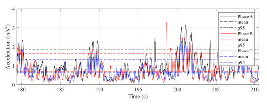 Figure 12 shows a sample time series for the floating platform for the same wave test (Bret 4) for different phases (A, B and C) of testing with various quantiles of the responses indicated on the figure. The changes are summarised for all wave tests and all phases in Figure 13. Relative changes to the mean and 95th percentile (p95) for each test were calculated with respect to the original undamaged state (Phase A). As seen in Figure 13, the vast majority of mean acceleration values change by +/−43%. Phases B, C, D, E and F change between +43% to +1%, +43% to +30%, +2% to −43%, −1% to +93% and −4% to −29%, respectively.