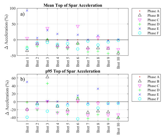 Relative changes in response acceleration between phases for Bretschneider wave excitation in terms of (a) mean values and (b) 95th percentile values.
